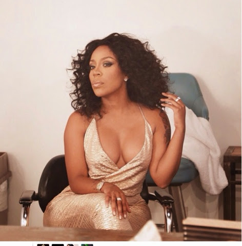photos show - K Michelle is in front of a sign for MBK Entertainment,